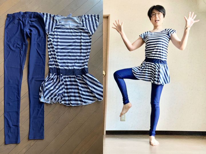 広げると、紺のレギンスとボーダーチュニックの水着でした。おお!これは普通に使える!ガチャあたりではないでしょうか?