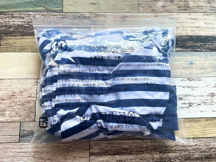 注文したら翌日に届く速さでさらにビックリ。開けてみると、「あれ?水着というよりも普通の服みたい?」紺と白のボーダーTが見えました。