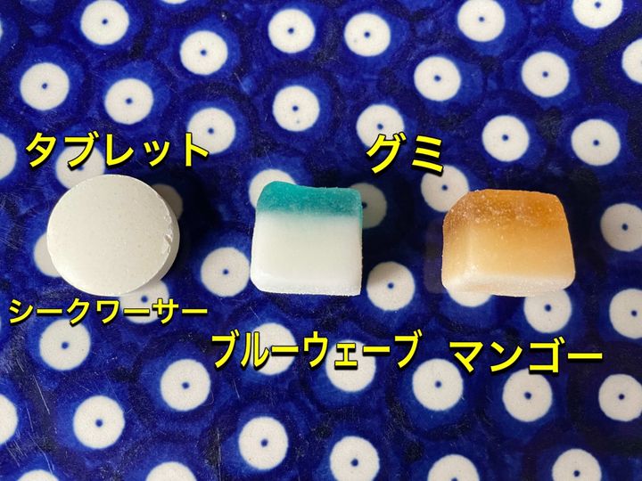 タブレットは、沖縄らしいシークワーサーシャーベット味。グミは、マンゴー味と、「ブルーシール」でしか食べられないブルーウェーブ味です。