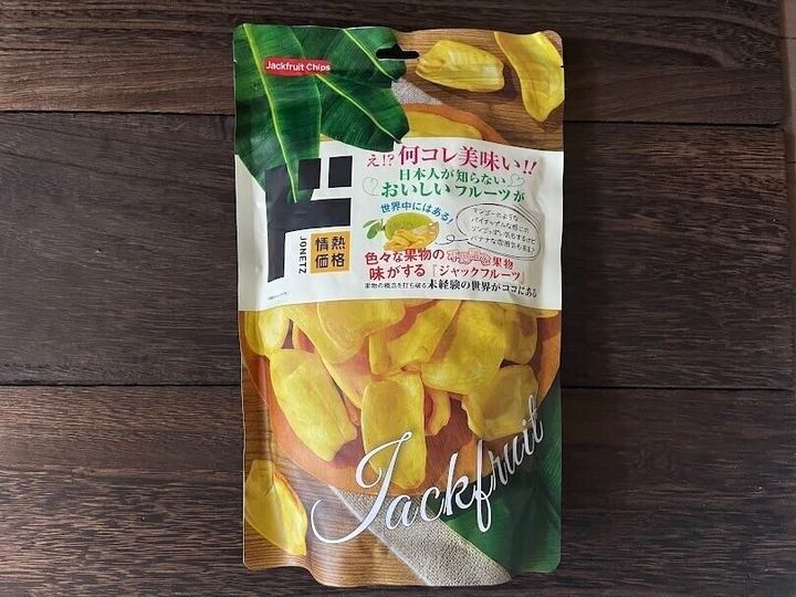 ドン・キホーテ以外では見たことがない「ジャックフルーツ」、食べてみるといろんな果物が混ざったような不思議な味でした。「ん?これはなんという味なのか…」と思いながら次に手が伸びて、意外とパクパク食べられます。食べたことがないなら、1度食べてみて欲しいお菓子です。特に、トロピカルフルーツが好きな人におすすめですよ。