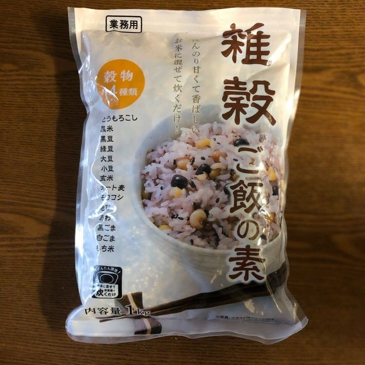 激安なのに、とうもろこし、黒米、黒豆、緑豆、大豆、小豆、玄米、オート麦、モロコシ、きび、あわ、黒ごま、白ごま、もち米、と14種類も穀物が入っています。