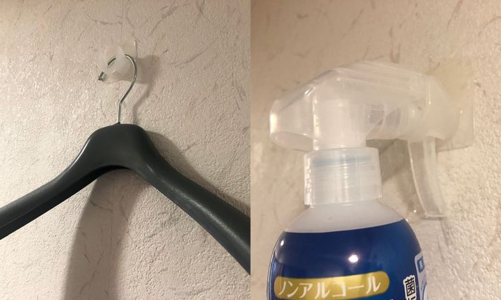 突っ張り棒だけでなく、もちろん普通にハンガーもかけられますし、なんとスプレーボトルを掛けることもできちゃいます!意外と困る消毒用スプレーの置き場所ですが、壁のフックに掛けられたらとっても便利ですよね!半透明タイプなのも目立ちにくくてGOODです。