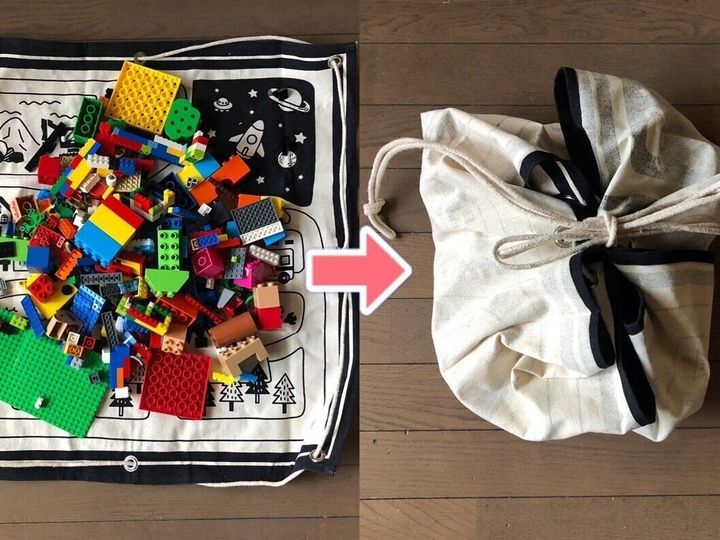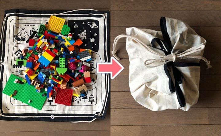 使い方は簡単です。おもちゃを乗せて、四つ角を真ん中へ折り込み、左右に紐を引っ張ればキュッとおもちゃがまとまります!散らばりがちなブロックなどに最適ですね。柄が地図のようにもなっているので、巾着マットの上でそのままブロックやミニカーなどで遊べます。遊び終わったら紐をギュッと締めてしまえばお片付け終わり!後は収納場所へポン!でOKですね。