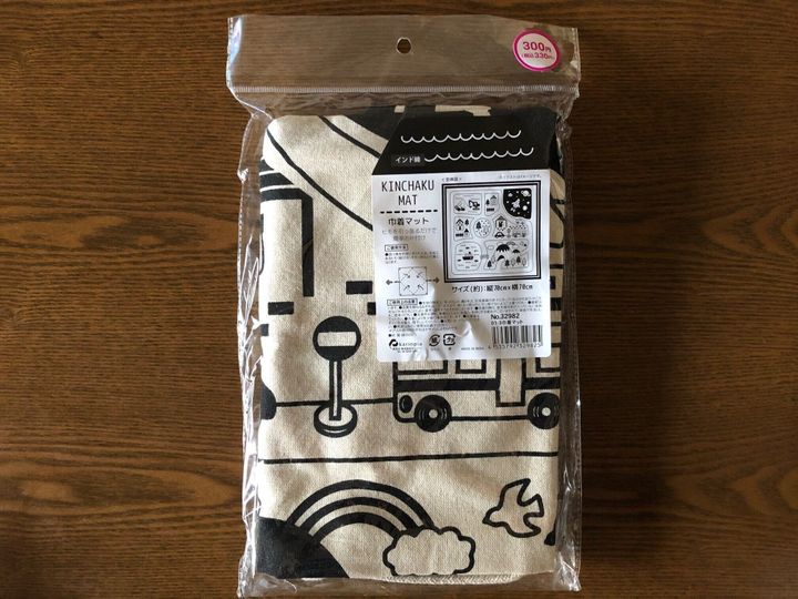 ブロックやミニカー以外にも、着せ替え人形やおままごと道具など、色々なものに使える巾着マット。子どものおもちゃにありがちな原色やパステルカラーではなく、モノトーンなのがインテリアの邪魔もせずに親の心を掴んでる!さすがダイソーさん!と思う商品でした。