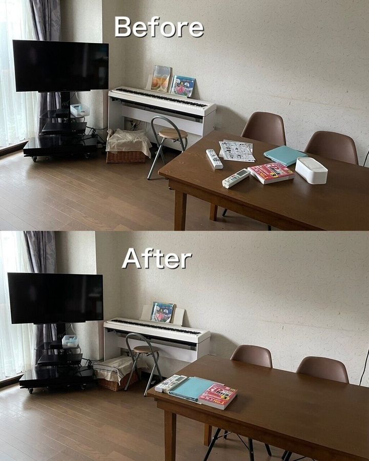 最初のチョイ技は「物の縦と横を揃える」です。例えば、テーブルに置かれた物の量がほぼ同じでも、テーブル全体に散らばっているのと、縦横を揃えて隅に置いたのなら、見た目のスッキリ感が全然違いますよね?