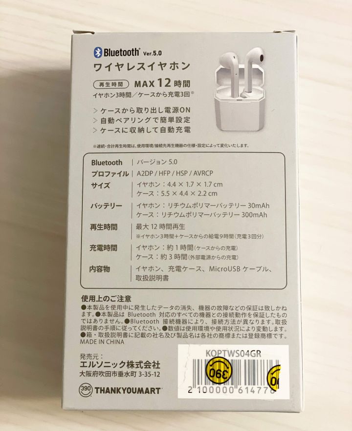 サンキューマートは店内全品390円(+税)のバラエティショップです。少しいい商品はその2倍のお値段で販売されています。こちらのワイヤレスイヤホンは、2倍の価格858円(税込)でした。色の展開は、ホワイト・ブルー・ピンク・グレーの4色です。(クマのシールは子供がカスタマイズして貼り付けました)