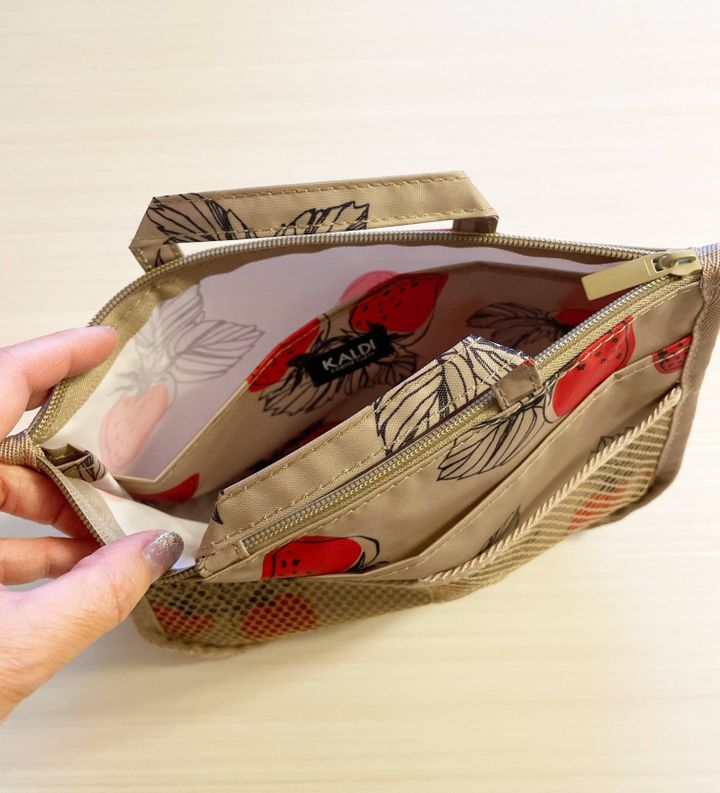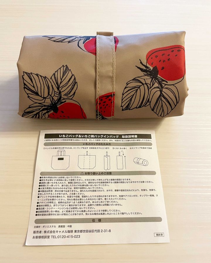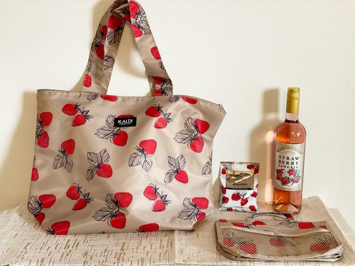 横が約48cm 縦が約27cmと大きめサイズなので、お買い物のエコバッグとしてもおすすめです。苺柄とベージュの下地が、ラブリーになり過ぎずcuteです。カルディのロゴ入りなので、それも嬉しいですね。