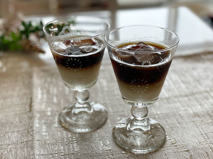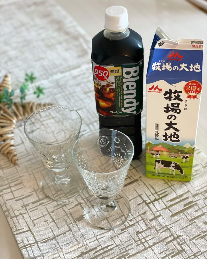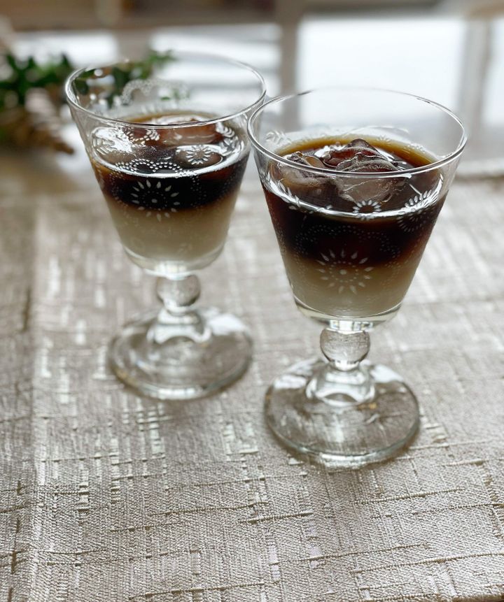 完成です!オシャレに出来上がりました。来客があっても、こんな風に出せたら盛り上がりますね。ガムシロップを入れる場合には、シロップは重いので、作る際にミルクに混ぜてから注ぐといいみたいです。