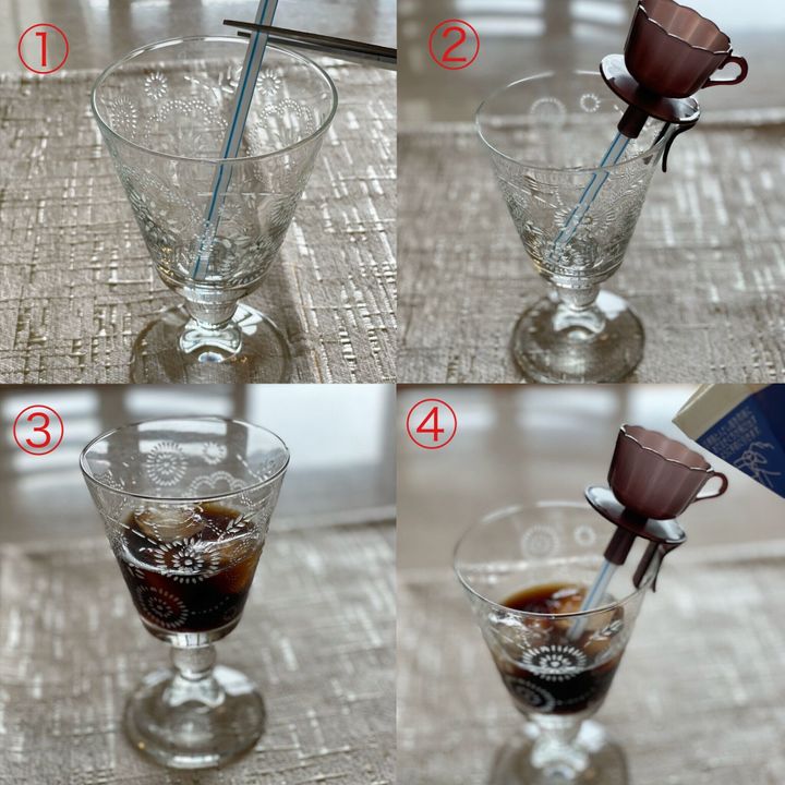 2. カップ型の容器にストローを差し込み、コップのフチに本体のフックを掛け、ストローが底についているかを確認。