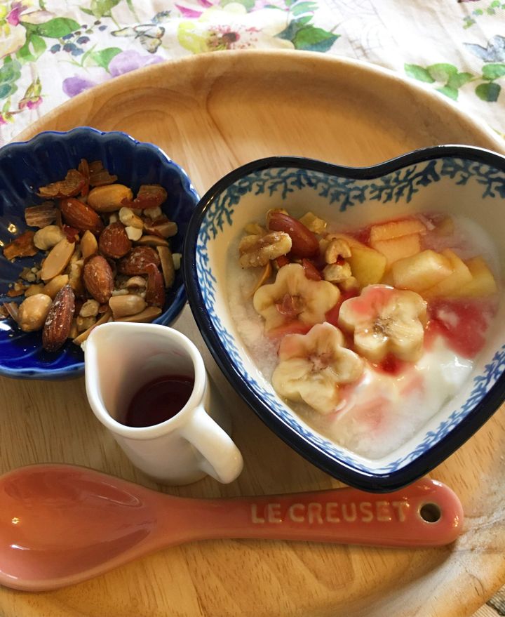 ヨーグルトにバナナやりんご、ナッツなどを入れて、美酢をシロップとしてかけて食べるのも美味しくておすすめです。さっぱりしていて、少し甘みもあるのでヨーグルトとの相性も良いです。