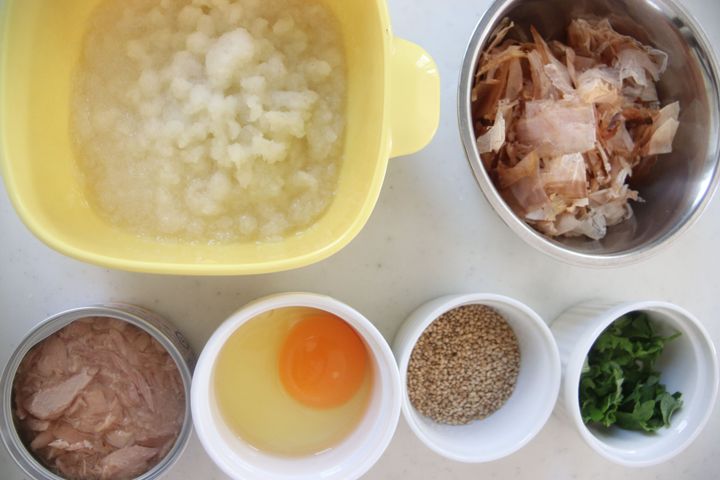 2.B(大根、卵、しょうゆ)を混ぜる。
