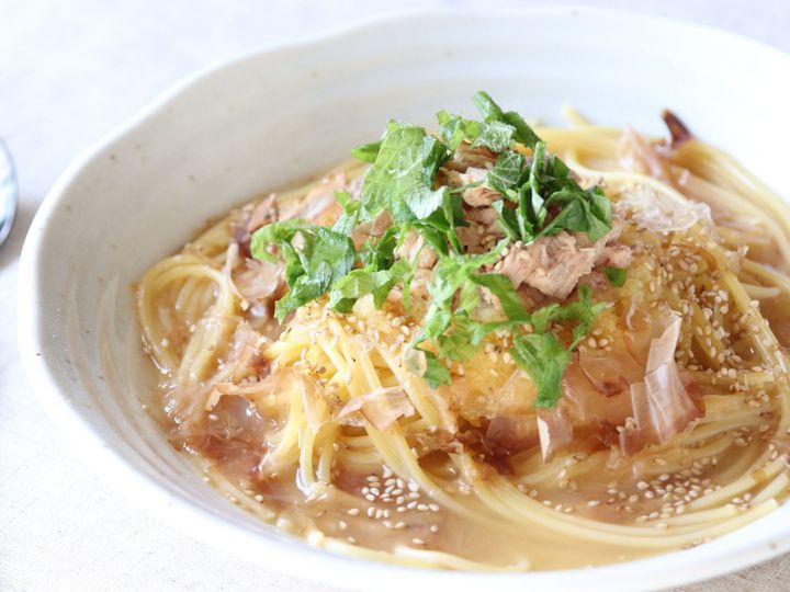 3.茹であがったスパゲッティ、スープを器に盛り、2とツナ缶、鰹節、炒りごま、大葉をのせる。