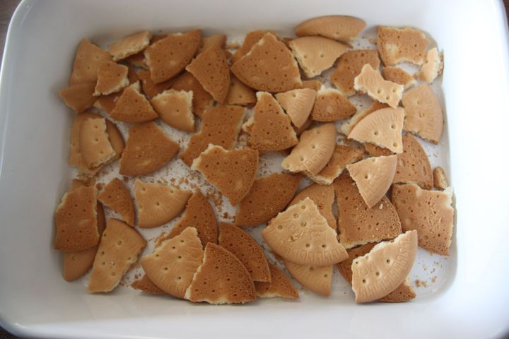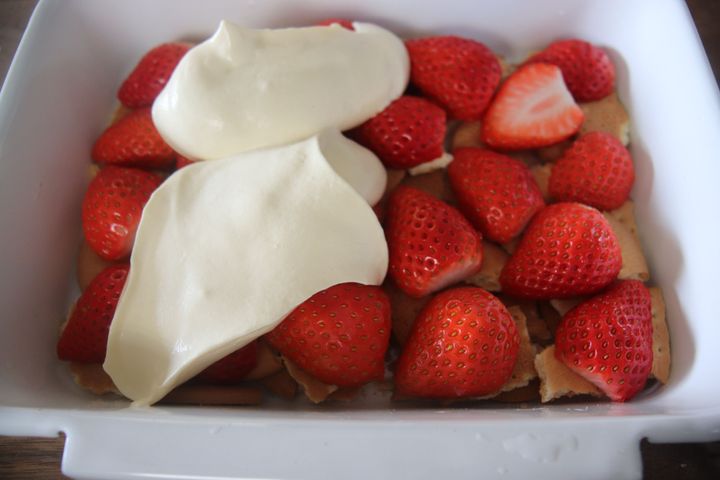 4.砕いたビスケットをバットに並べる。その上にイチゴを並べる。