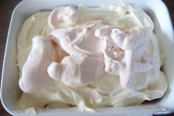 6.クリームの残り半分に食紅(ピンク)を加えて混ぜ、ピンク色のクリームを作り、5の上にのせて広げる。