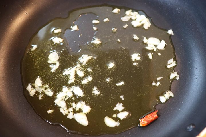 2.フライパンにみじん切りにしたにんにくとオリーブオイルを入れて、弱火で香りをうつす。鷹の爪を入れて、辛味をうつす。