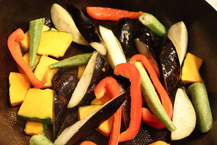 2.フライパンにたっぷりのオリーブオイルを熱し、野菜を揚げ焼きにする。