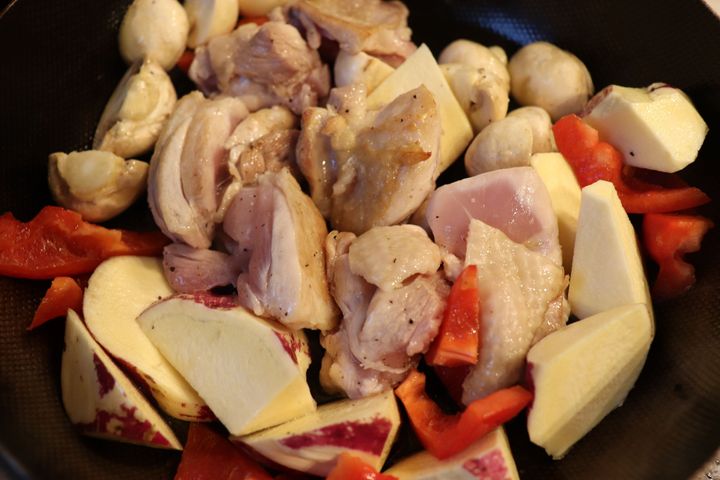 2.フライパンにオリーブオイルを入れて熱し、鶏肉を炒め、焼き色がついたら、マッシュルーム、パプリカ、サツマイモを入れて炒める。