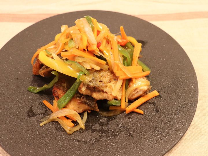 お野菜をたっぷりのせた鮭の南蛮漬け。