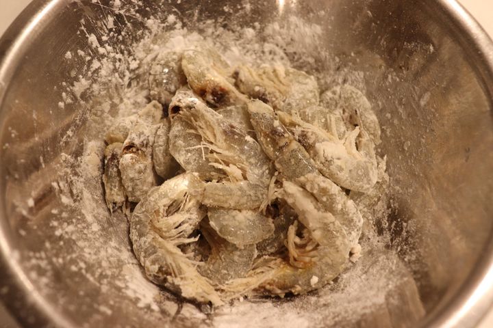 芝エビの下処理もキッチンばさみで簡単に!そのあとは下味をつけて片栗粉をまぶして揚げるだけなので、とっても簡単です。