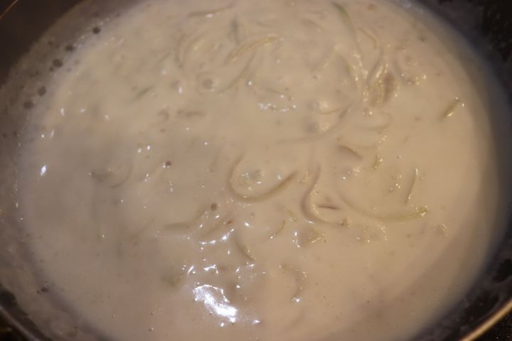 7.とろみがついてきたら、塩、胡椒(お好みで)を入れて、火を止める。