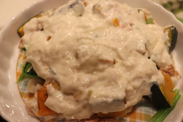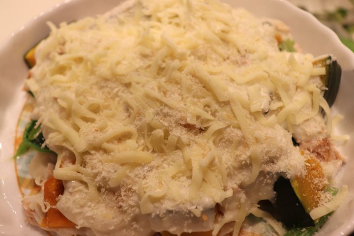 8.耐熱皿に鮭、ほうれん草、南瓜を重ね、その上に7のホワイトソースをのせる。更に、とろけるチーズをのせ、パン粉をふりかけ、あらかじめ230度に予熱したオーブンで、20分焼く。美味しそうな焼き色がついたら、できあがり!