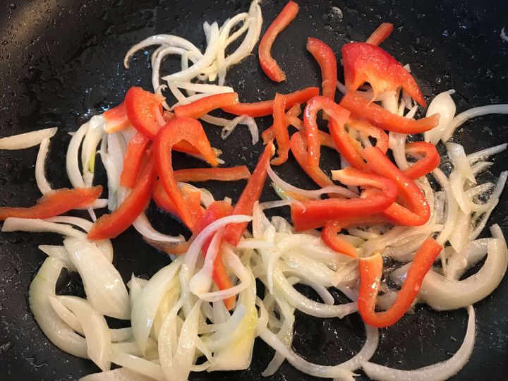 1.(下準備)玉ねぎは薄切り、赤パプリカは細切りにする。