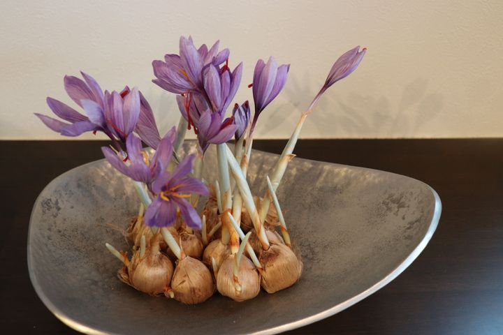 水も土もいりません。本当にほったらかしでお部屋のカウンターに飾っていただけで(置いておいただけで)花が咲き、りっぱなサフランを収穫することができました!