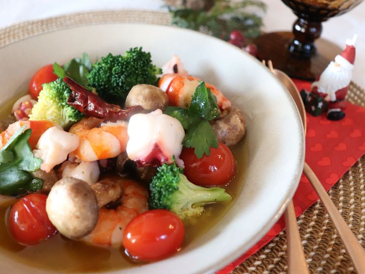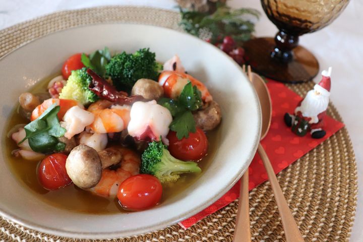 【クリスマスやおもてなしにも!】海老とタコと野菜のアヒージョ