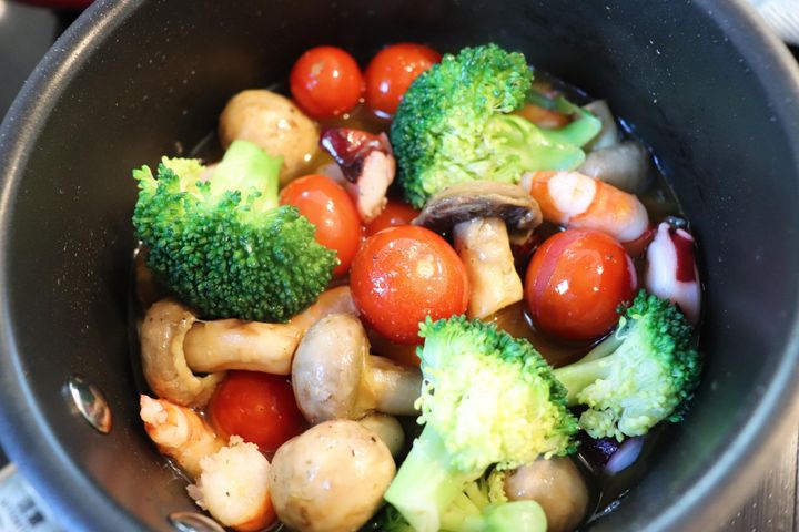 3.にんにくの香りがしてきたら、鷹の爪を取り出して、マッシュルーム、海老を入れる。弱火でしばらくぐつぐつさせてから、タコ、ブロッコリー、プチトマトを入れる。