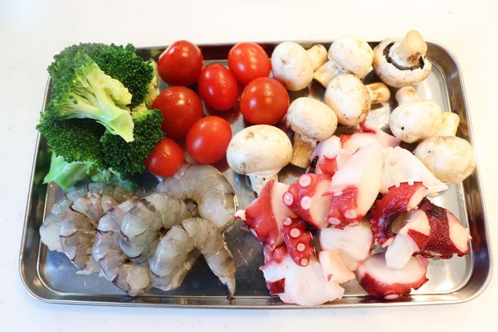 1.(下準備)海老は殻をむき、背ワタを取り、塩、胡椒、白ワインを振っておく。タコは一口大に切る。マッシュルームは石づきを取る。ブロッコリーは子房に分けて、固めに下茹でしておく。にんにくは、つぶして少し厚めにスライスする。