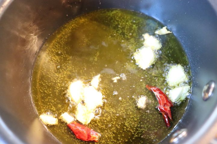 2.小鍋にオリーブ油、にんにく、半分にして種を除いた鷹の爪、塩を入れて、火にかける。