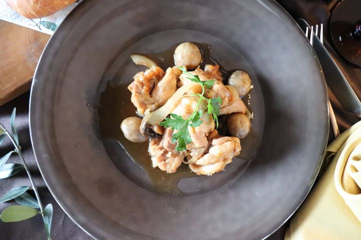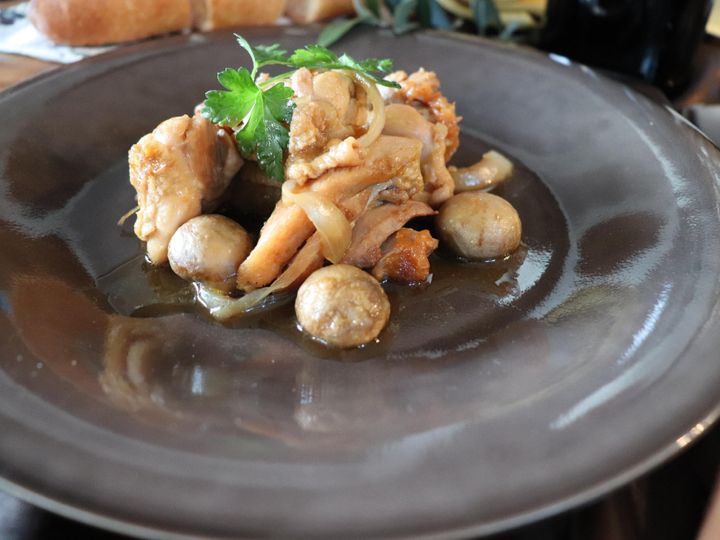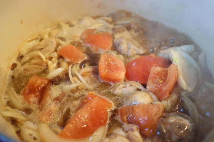 1.鶏肉は食べやすい大きさに1枚を4~5つに切る。玉ねぎは薄切りにする。マッシュルームは石づきの先を切り落とす。トマトはざく切りにする。