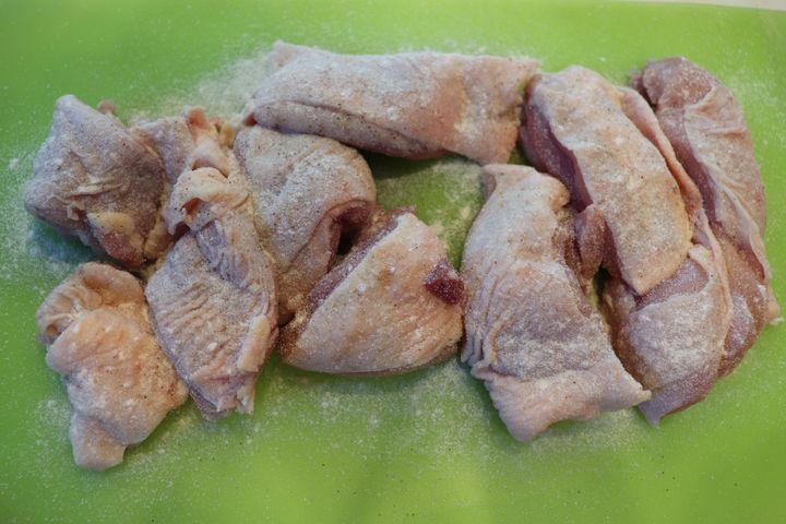 2.鶏肉にしっかり塩、胡椒をふり、小麦粉をはたく。