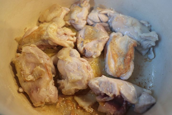 3.鍋にオリーブオイルを入れて熱し、鶏肉の皮目のほうから焼いていく。