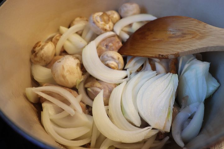 4.両面にしっかり焼き色をつけたら、玉ねぎ、マッシュルームを入れて炒める。