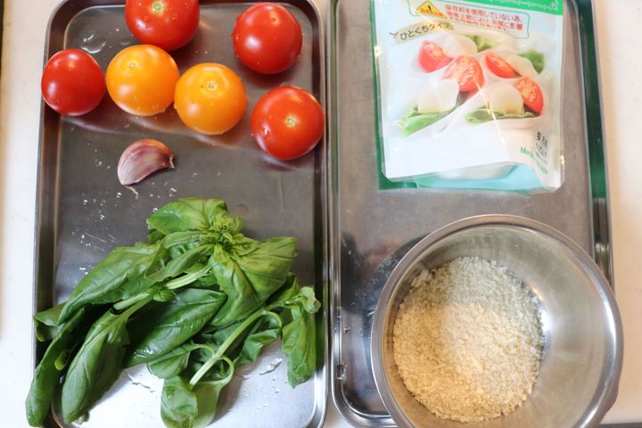1.トマトを半分に切って、中の種を取り出す。モッツアレラも半分に切る。
