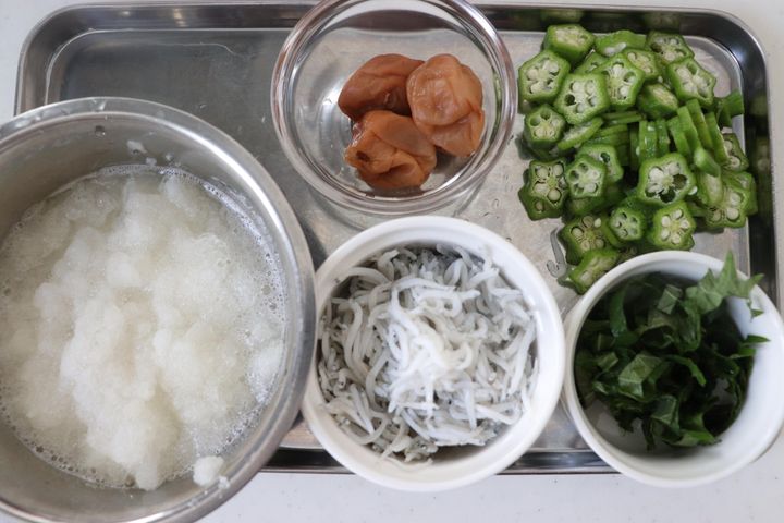 2.うどんを器に盛り、大根、オクラ、釜揚げしらす、大葉、梅干、プチトマトをのせ、麺つゆをかける。