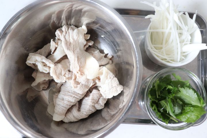 1.鍋に水1リットルに対して塩小さじ1(分量外)、酒大さじ2(分量外)を入れて沸騰させ、豚肉を入れて色が変わったらザルに取り出して冷ましておく。