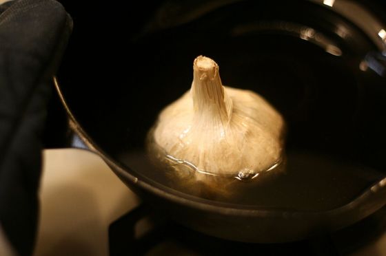 1.冷たい油ににんにくを丸ごと入れ火をつける。