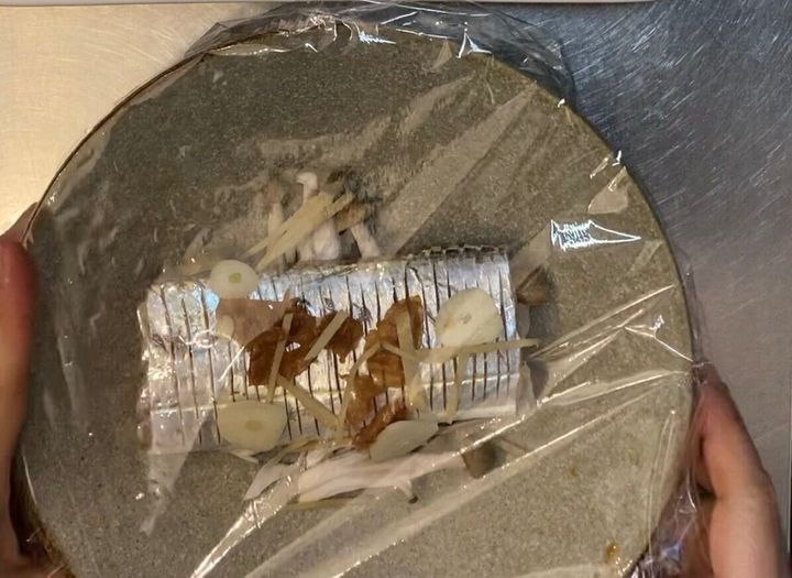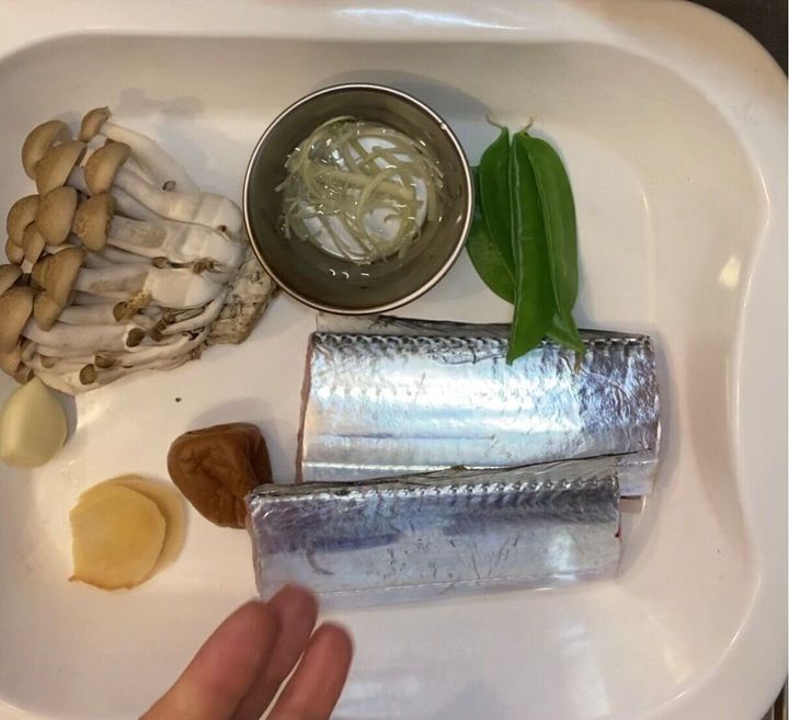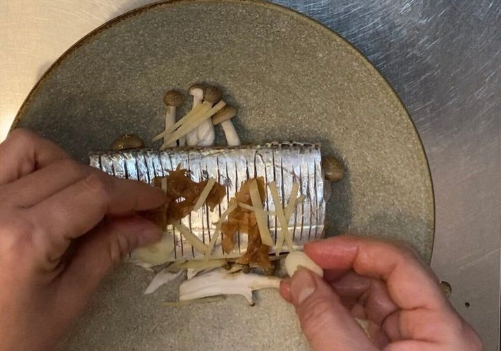 7.耐熱容器にしめじ、太刀魚、生姜、にんにく、梅干しもちぎってのせる。