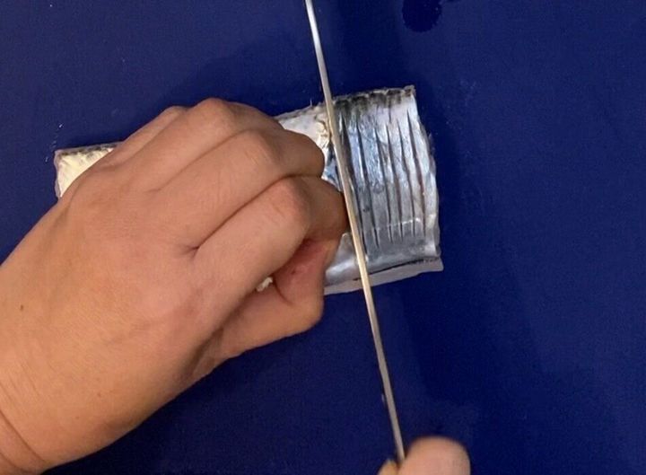 5.太刀魚は背びれをカットし両面に切り込みを入れる。