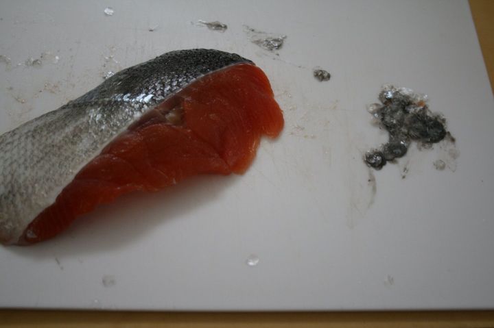 3.鮭は皮に鱗が残っているので包丁でこそげ取る。