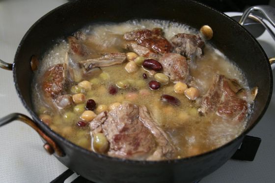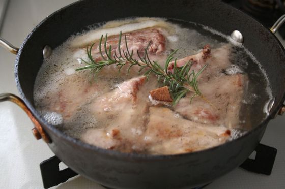 2.余分な脂をペーパーで拭きかぶるくらいのお湯、コンソメ、酢、ハーブを入れ中火弱で柔らかくなるまで40~50分煮る。(途中でアクを取り水分が少なくなったら足して下さい。)