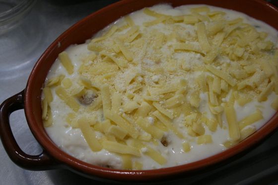 1.ピラフを耐熱容器に入れホワイトソースを流しピザ用チーズ、パルメザンチーズを散らし