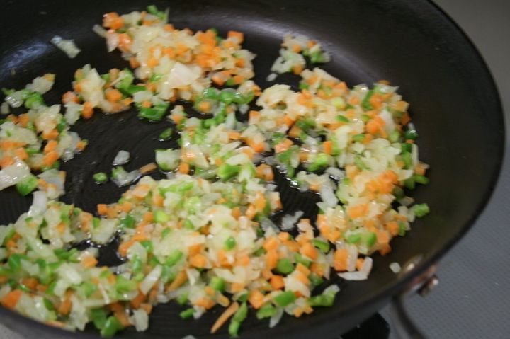2.フライパンをさっとペーパーで拭きオリーブオイル大さじ2を入れ、玉ねぎ、人参、ピーマンを炒める。