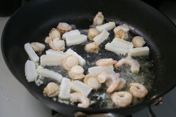 1.オリーブオイル大さじ1を熱しシーフードミックスを炒め白ワイン大さじ2を加えてアルコールを飛ばす。一度取り出して置く。