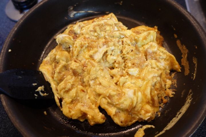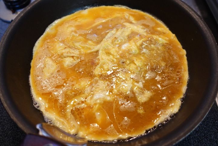 ②油をひいたフライパンで①を半熟スクランブルエッグにする