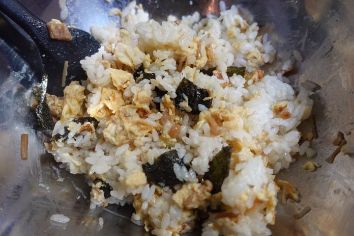 ③ボウルに焼いた卵とごはん、味のりをいれてざっくり混ぜる