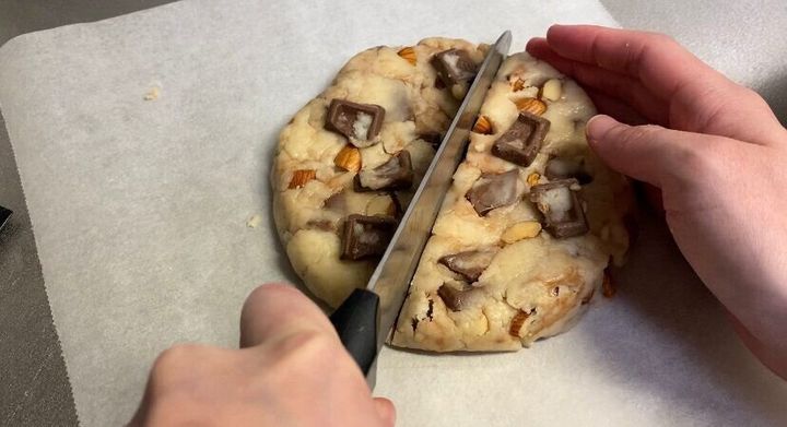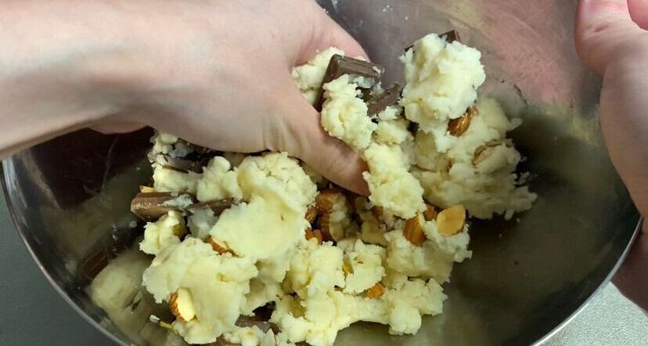 ②まとまってきたら適当な大きさにカットした板チョコやアーモンドをいれてひとまとめにする