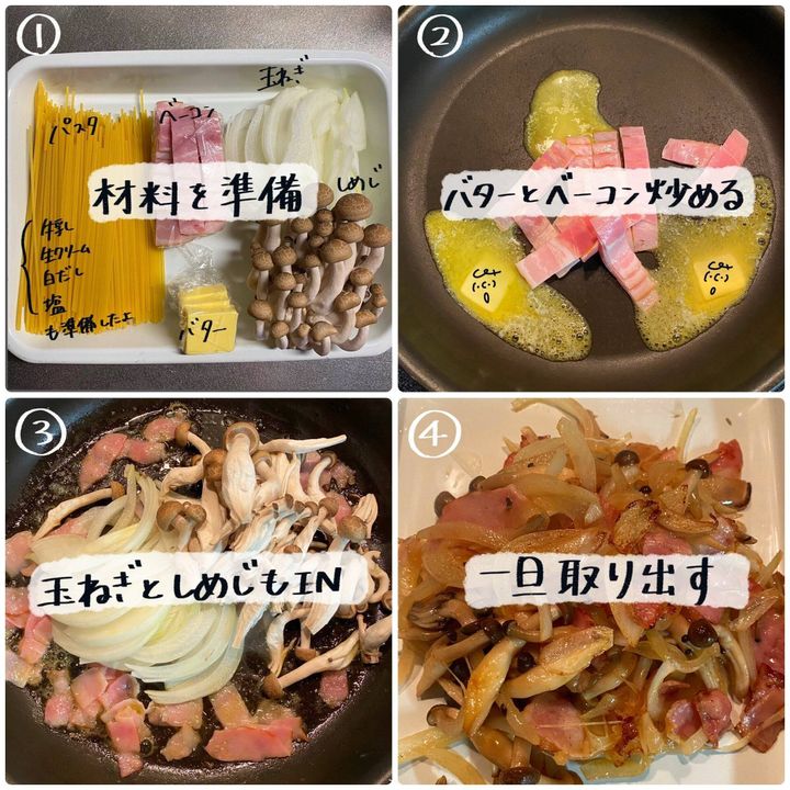 しめじはバラバラに、ベーコンは適当な幅に切る)